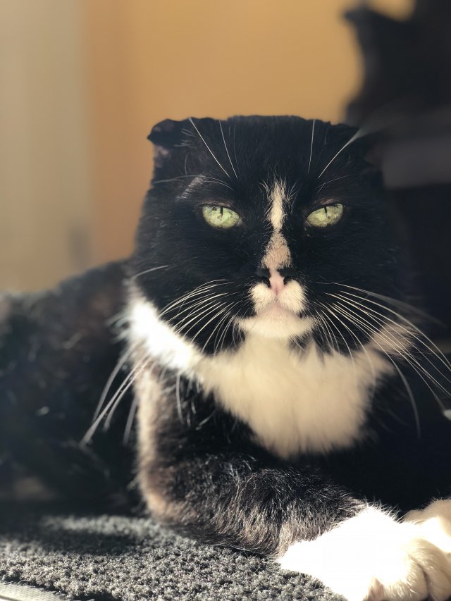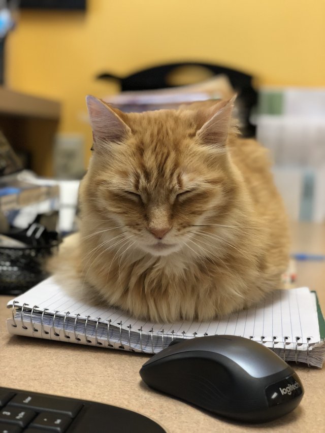 Sampson joined the clinic in June, 2022. He first appeared as a stray at Dr. Hanifen's house. He's still settling in here, but is always here to give the best kitty hugs. He enjoys climbing around the clinic in his free time.